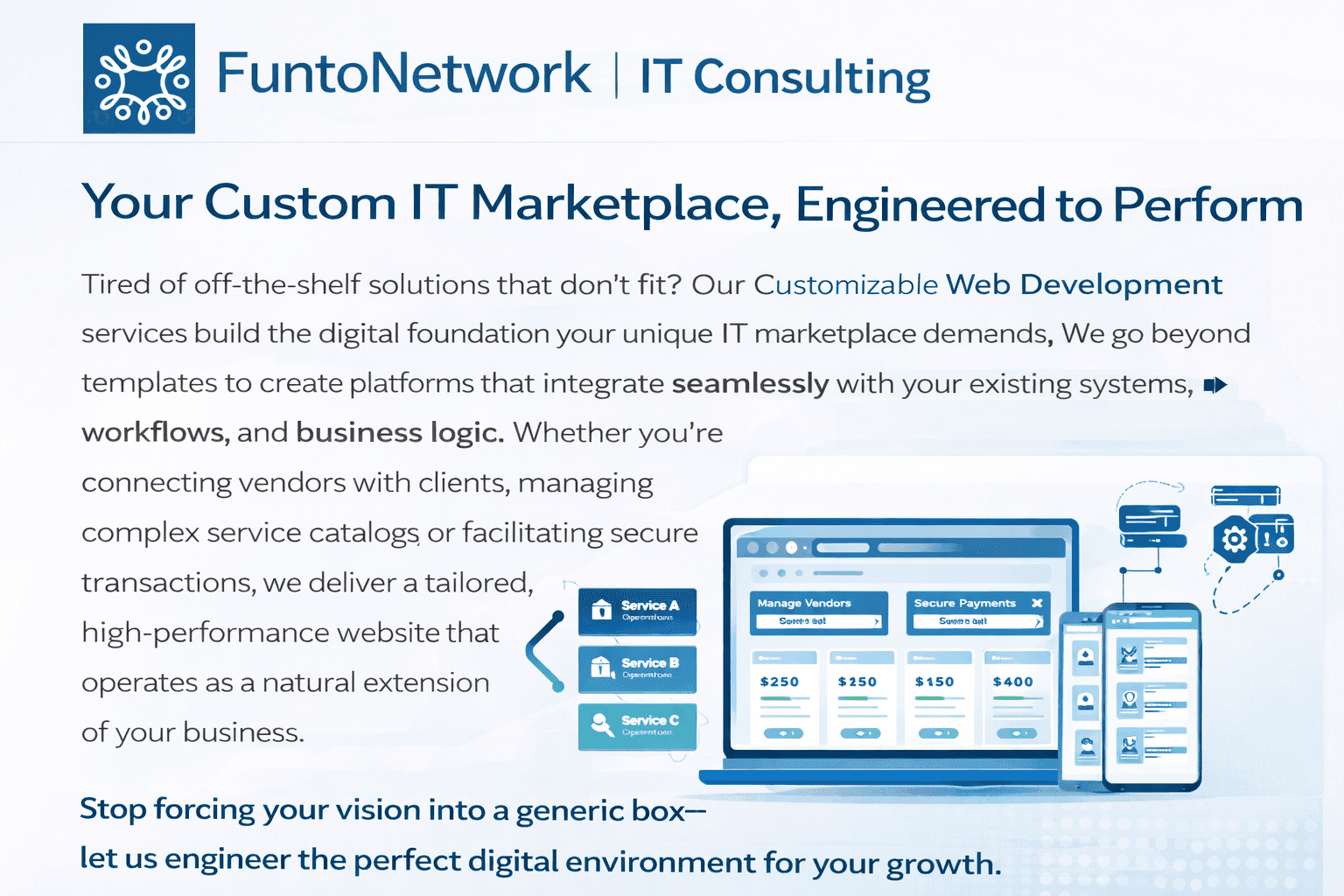 Tired of off-the-shelf solutions that don't fit? Our Customizable Web Development services build the digital foundation your unique IT marketplace demands. We go beyond templates to create platforms that integrate seamlessly with your existing systems, workflows, and business logic. Whether you're connecting vendors with clients, managing complex service catalogs, or facilitating secure transactions, we deliver a tailored, high-performance website that operates as a natural extension of your business. Stop forcing your vision into a generic box—let us engineer the perfect digital environment for your growth.