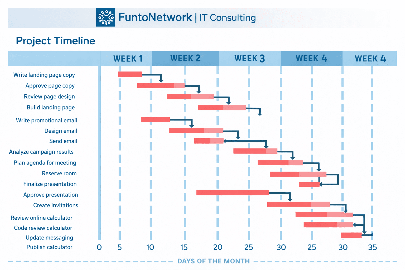 At FuntoNetwork, we deliver clarity and confidence through our transparent, four-phase project management framework. Your project begins with meticulous planning and discovery (Week 1), followed by agile execution with weekly progress visibility (Weeks 2-3), and culminates in rigorous testing and seamless deployment (Week 4). With dedicated ownership, proactive risk mitigation, and strict adherence to timeline and budget, we transform complex IT initiatives—from virtualization to cloud migration—into predictable, measurable successes that translate directly into business value. Experience project management that actually delivers.