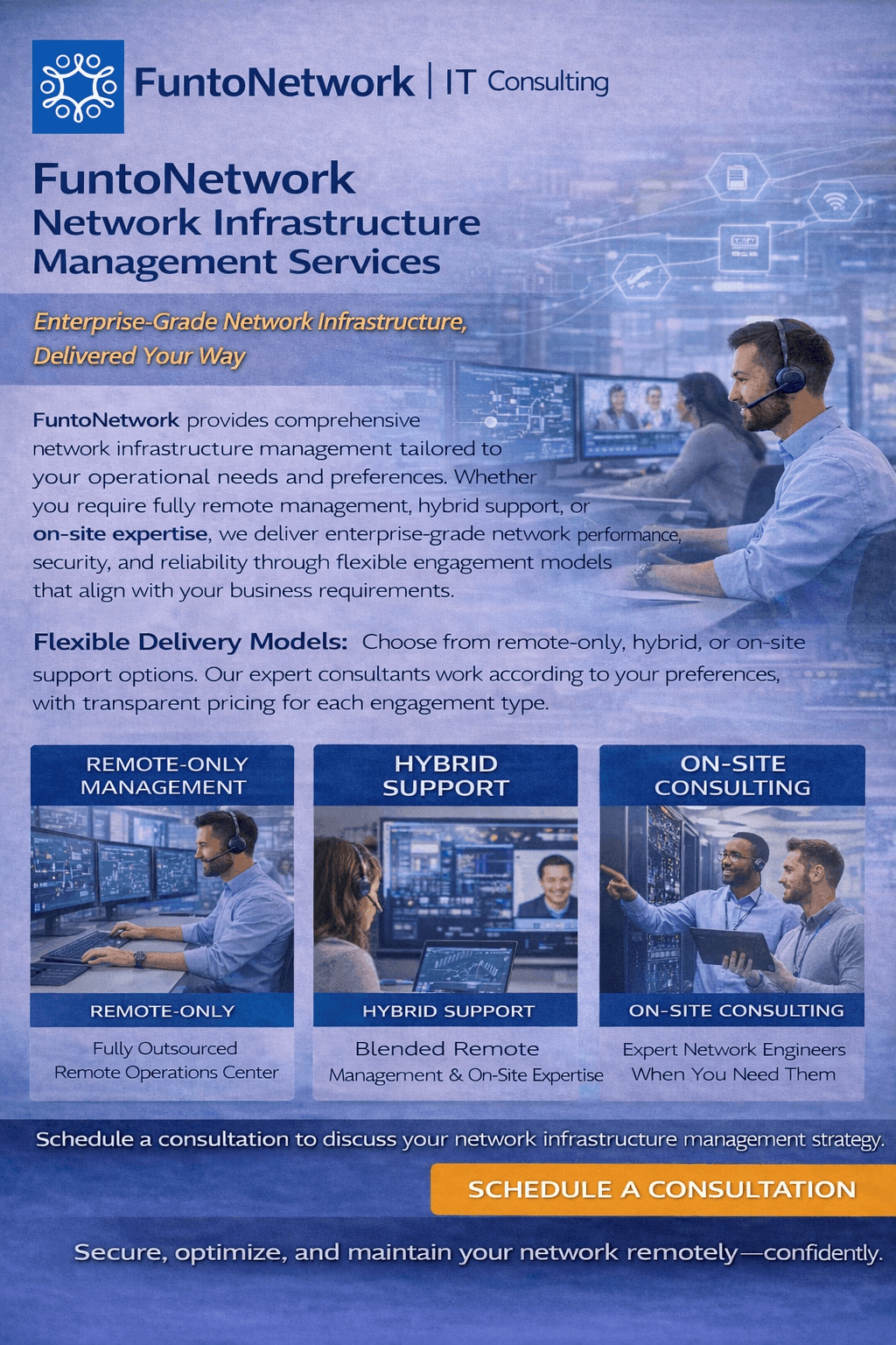 FuntoNetwork provides comprehensive network infrastructure management tailored to your operational needs and preferences. Whether you require fully remote management, hybrid support, or on-site expertise, we deliver enterprise-grade network performance, security, and reliability through flexible engagement models that align with your business requirements.